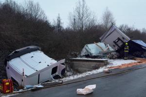 Kamion skončil mimo komunikaci a nárazem se kabina i s řidičem utrhla