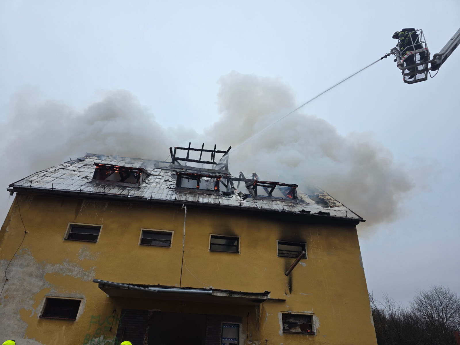 Zasahují profesionální hasiči z centrální hasičské stanice Česká Lípa a ze stanice Jablonné v Podještědí, a dále dobrovolní hasiči z Mimoně, Stráže pod Ralskem a Jablonného v Podještědí. Aktuálně pomocí výškové techniky hasiči rozebírají střešní konstrukci a hledají skrytá ohniska.