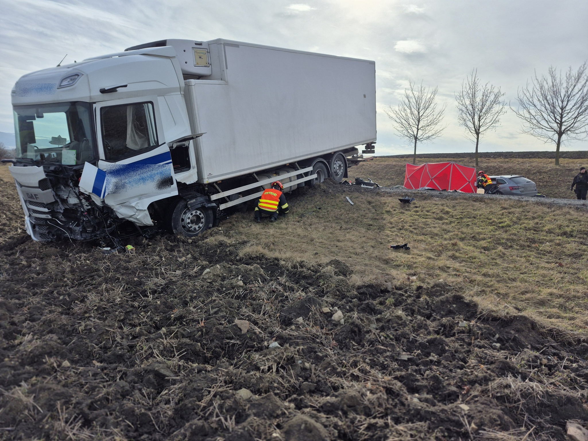 V pátek ve 13:40 vyjížděli profesionální hasiči ze stanice Uherský Brod se dvěma zásahovými vozidly k tragické dopravní nehodě osobního a nákladního automobilu na silnici mezi Bánovem a Uherským Brodem.