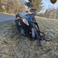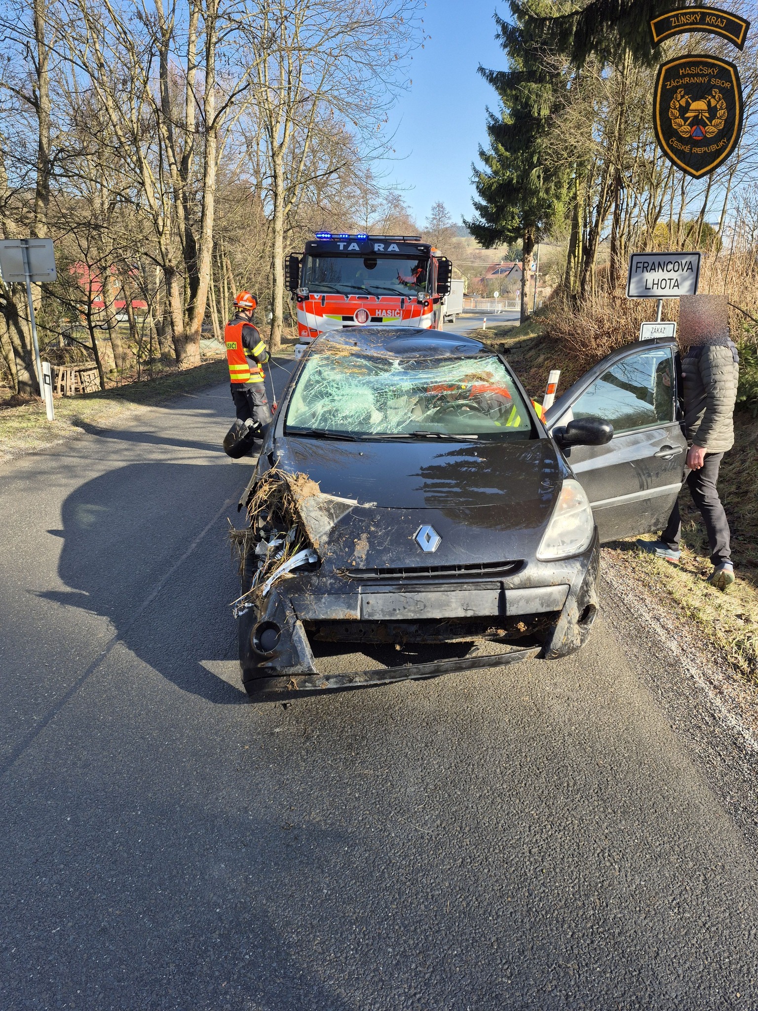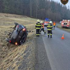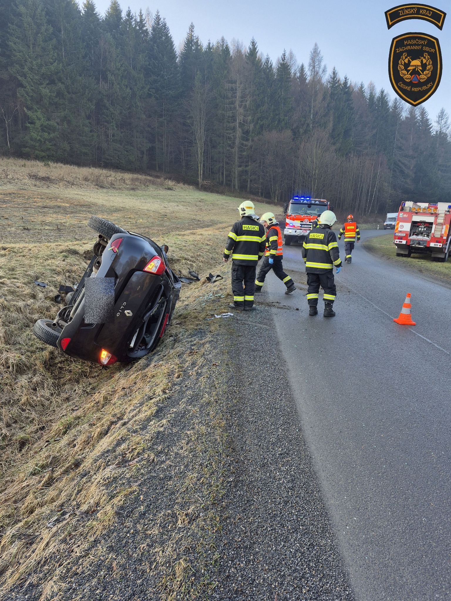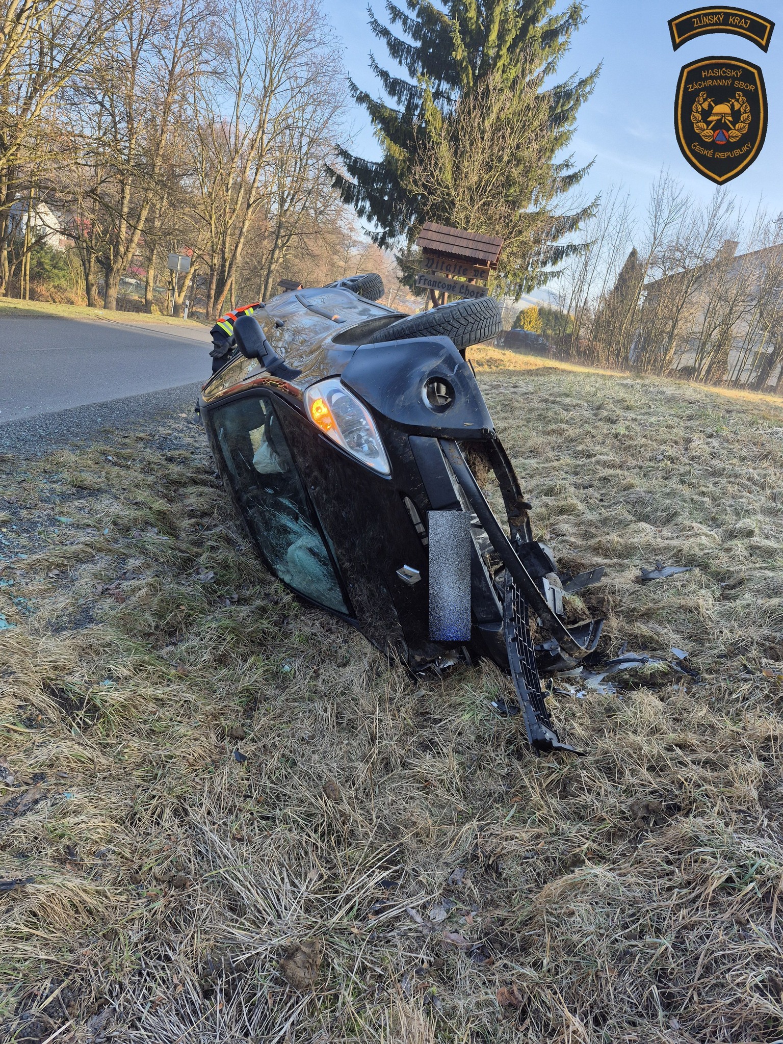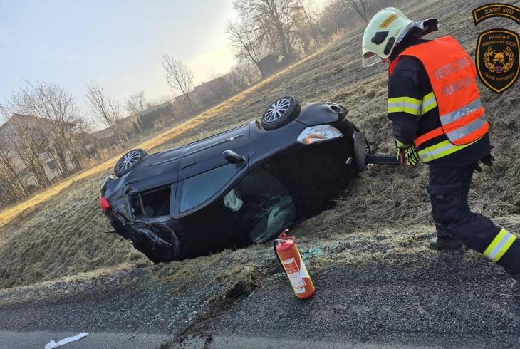 V katastru obce Francova Lhota na Vsetínsku došlo dnes ráno k dopravní nehodě osobního vozidla, které na namrzlé vozovce sjelo mimo komunikaci a skončilo převrácené na boku v příkopě.
