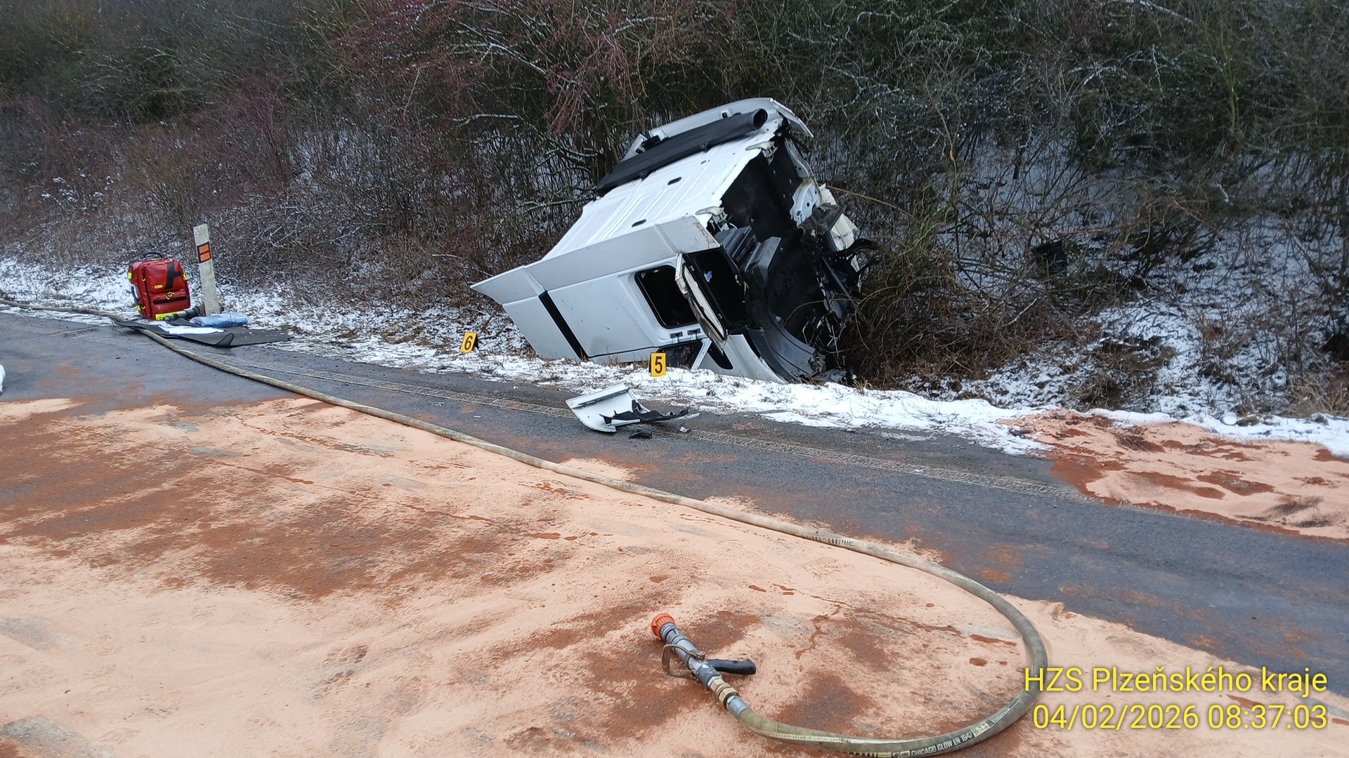 Událost provázel masivní únik provozních kapalin. Podle odhadu vyteklo do příkopu přibližně 200 litrů nafty. Vzhledem k tomu, že místo není napojeno na žádnou vodoteč, nedošlo k bezprostřednímu ohrožení vodních zdrojů, přesto byl o situaci informován odbor životního prostředí. Na místo se dostavila odborná firma, která zajistila odčerpání uniklého paliva z terénu i zbývající nafty z nádrží vozidla. Jednotky zajistily místo nehody, provedly protipožární opatření a posyp vozovky sorbentem.