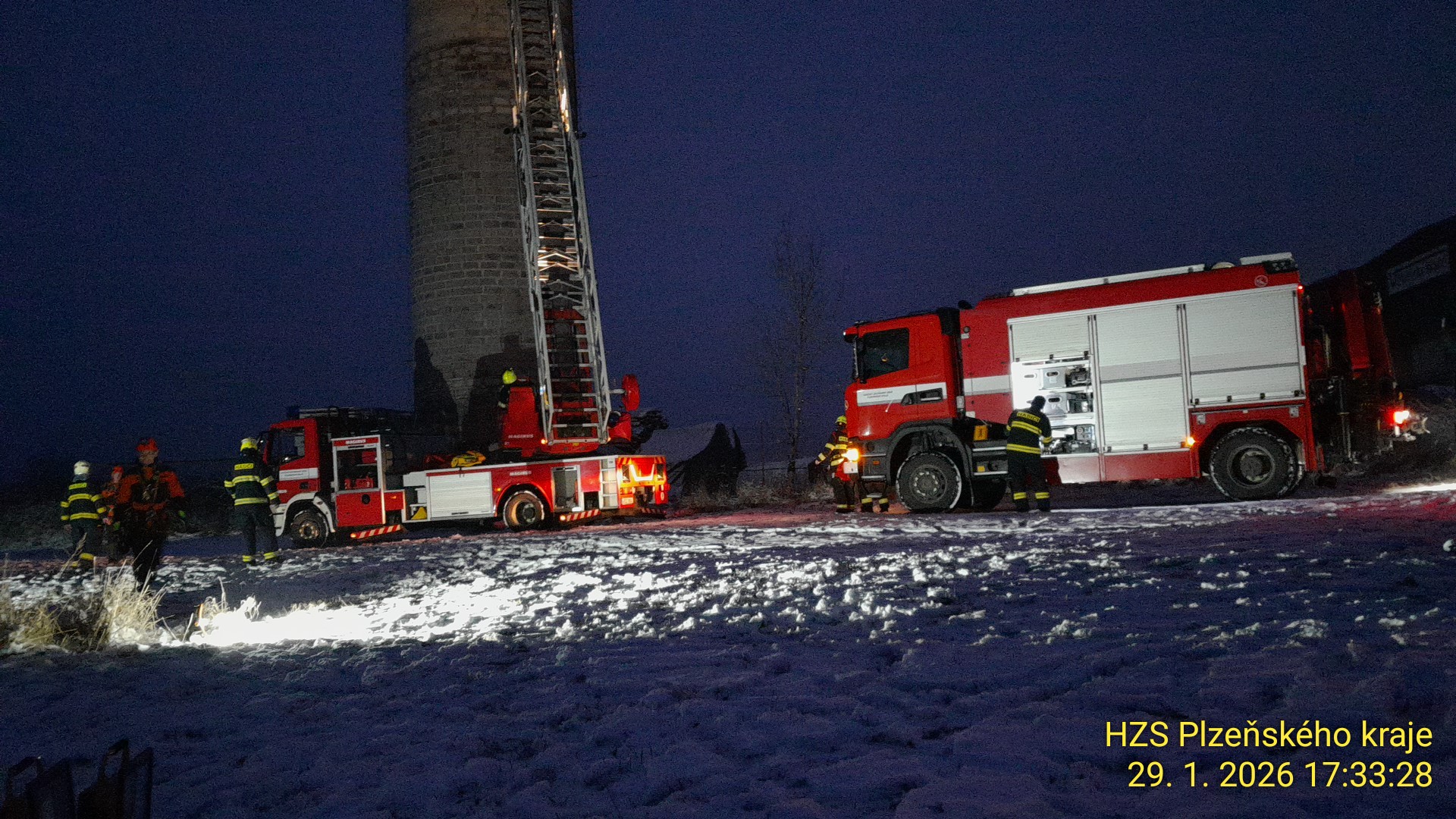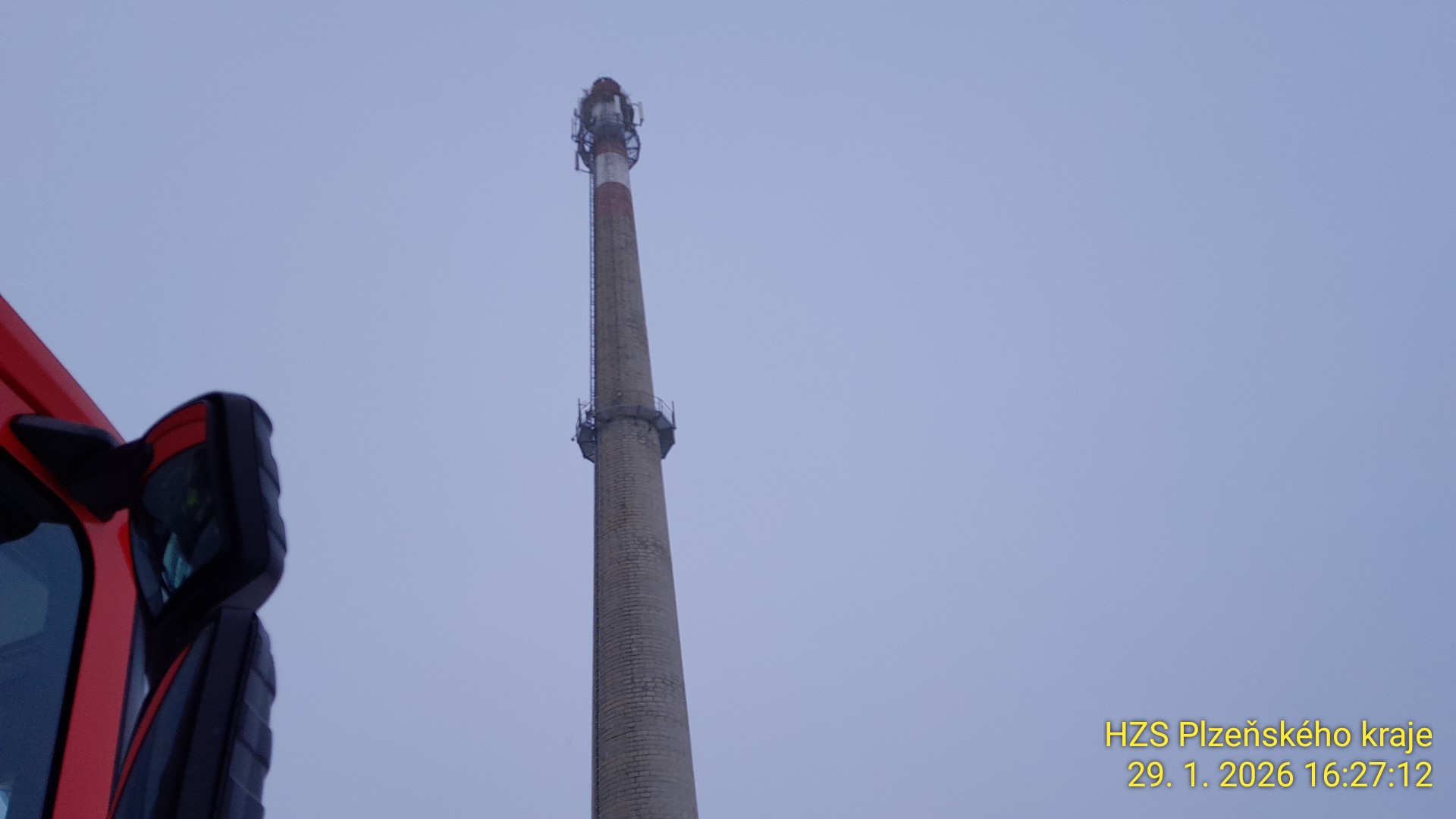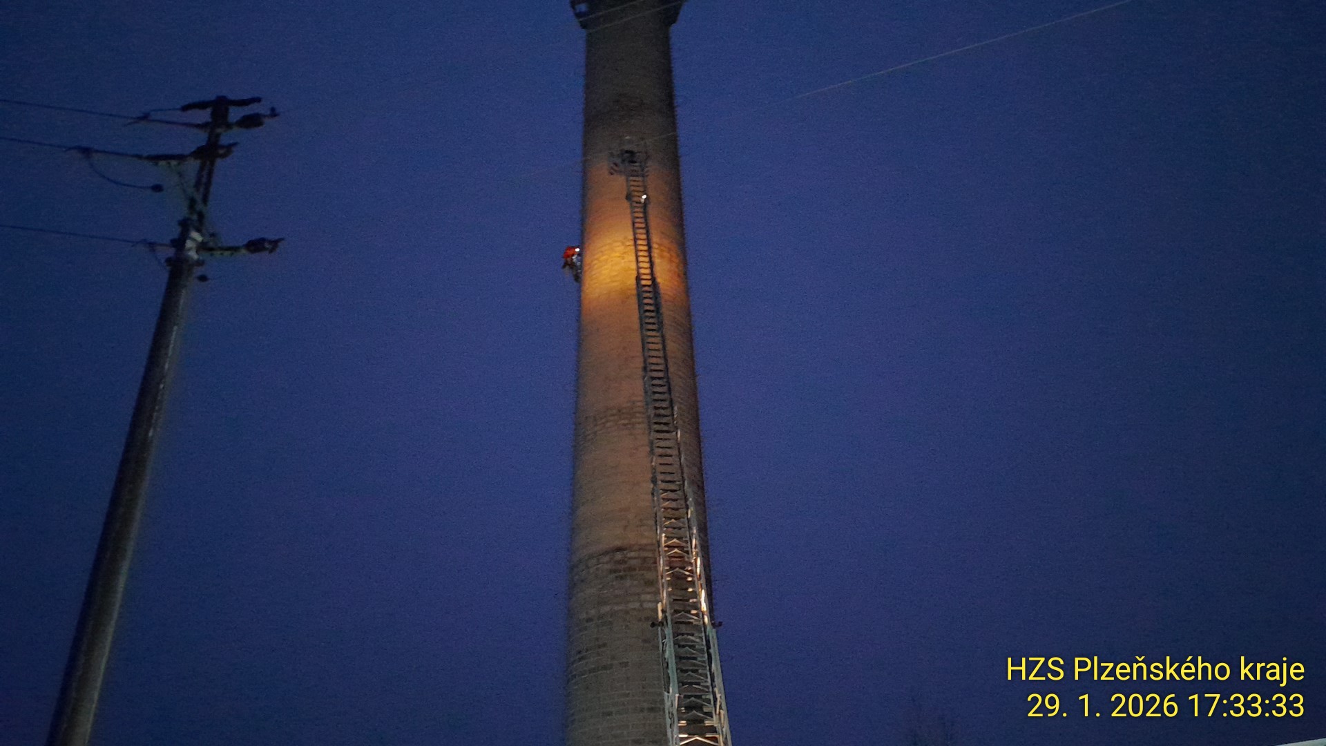 Od odpoledních hodin jsme zasahovali u záchrany osoby na nejvyšším ochozu komínu ve Strašicích. Mladý muž chtěl ukončit svůj život skokem dolů.