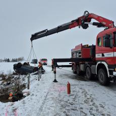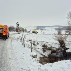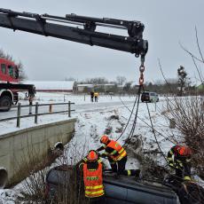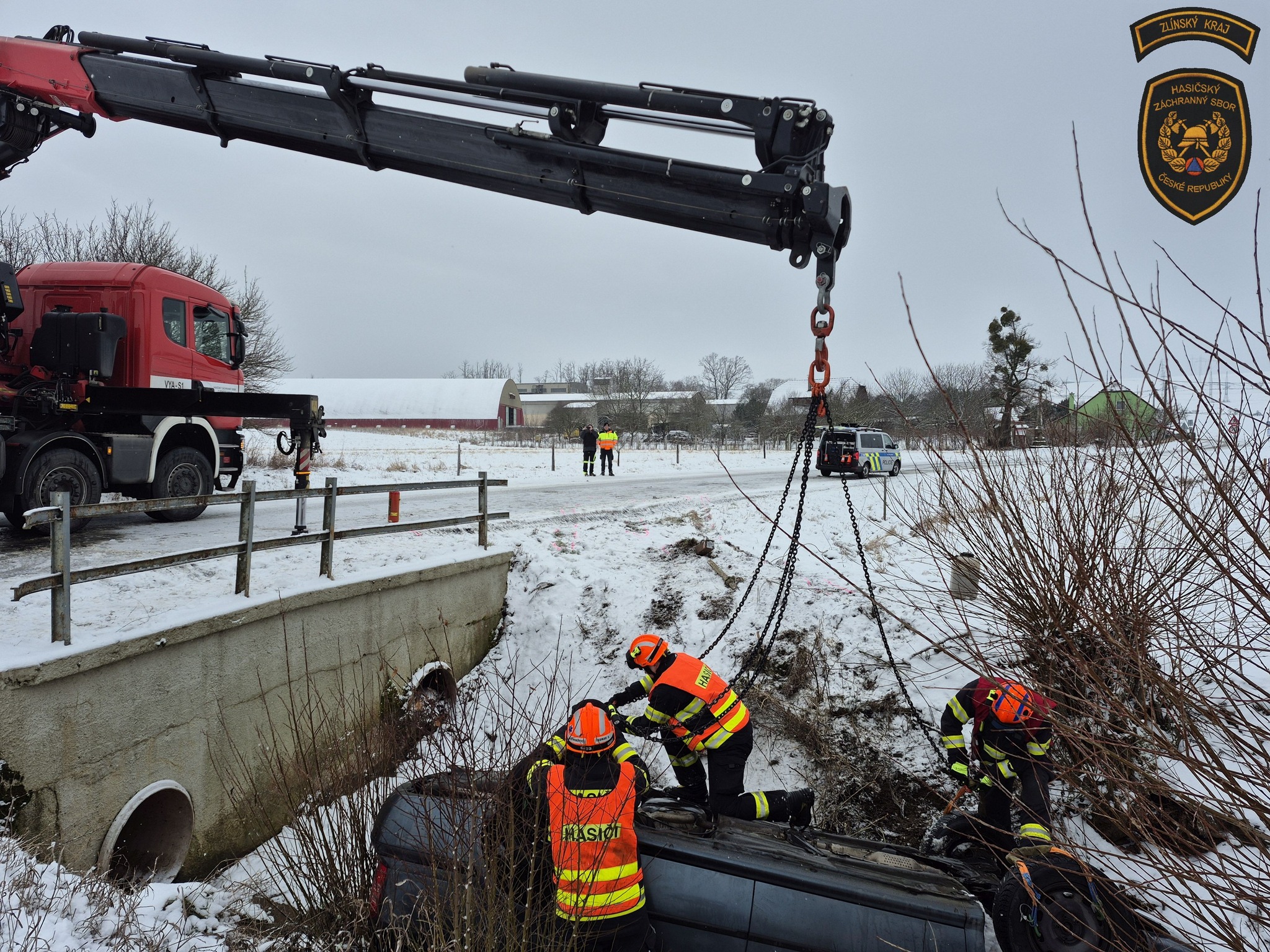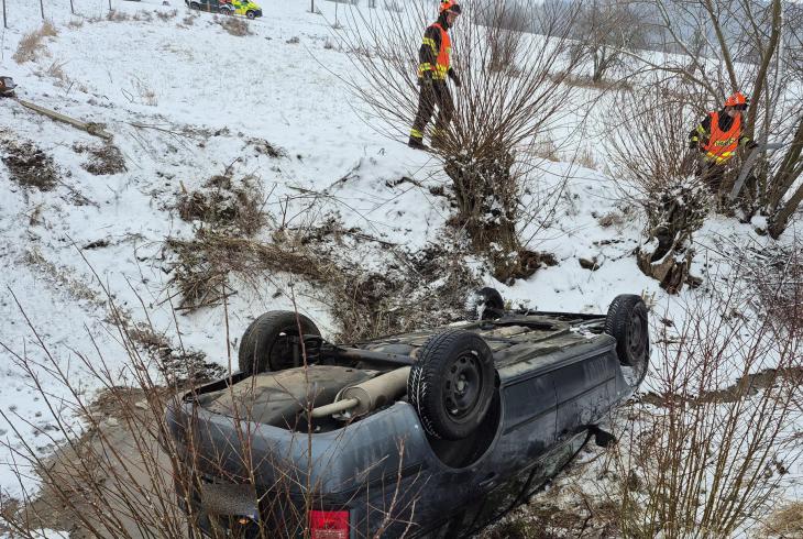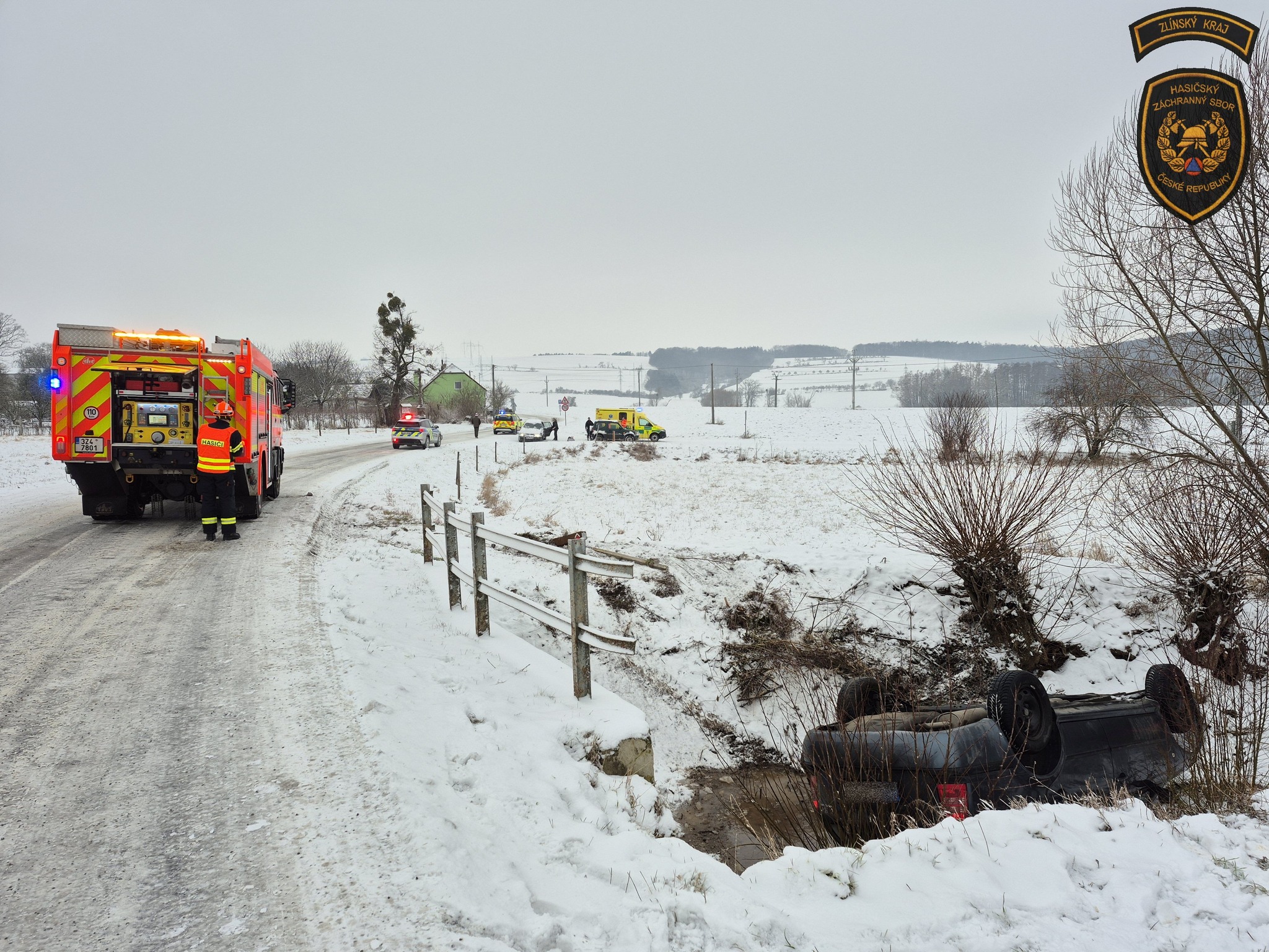 K dramatické dopravní nehodě došlo v úterý před půl osmou ranní na zasněžené komunikaci u obce Kvasice na Kroměřížsku. Řidička osobního vozidla, která cestovala se dvěma dětmi, sjela mimo silnici, kde se automobil převrátil na střechu do koryta místního potůčku.