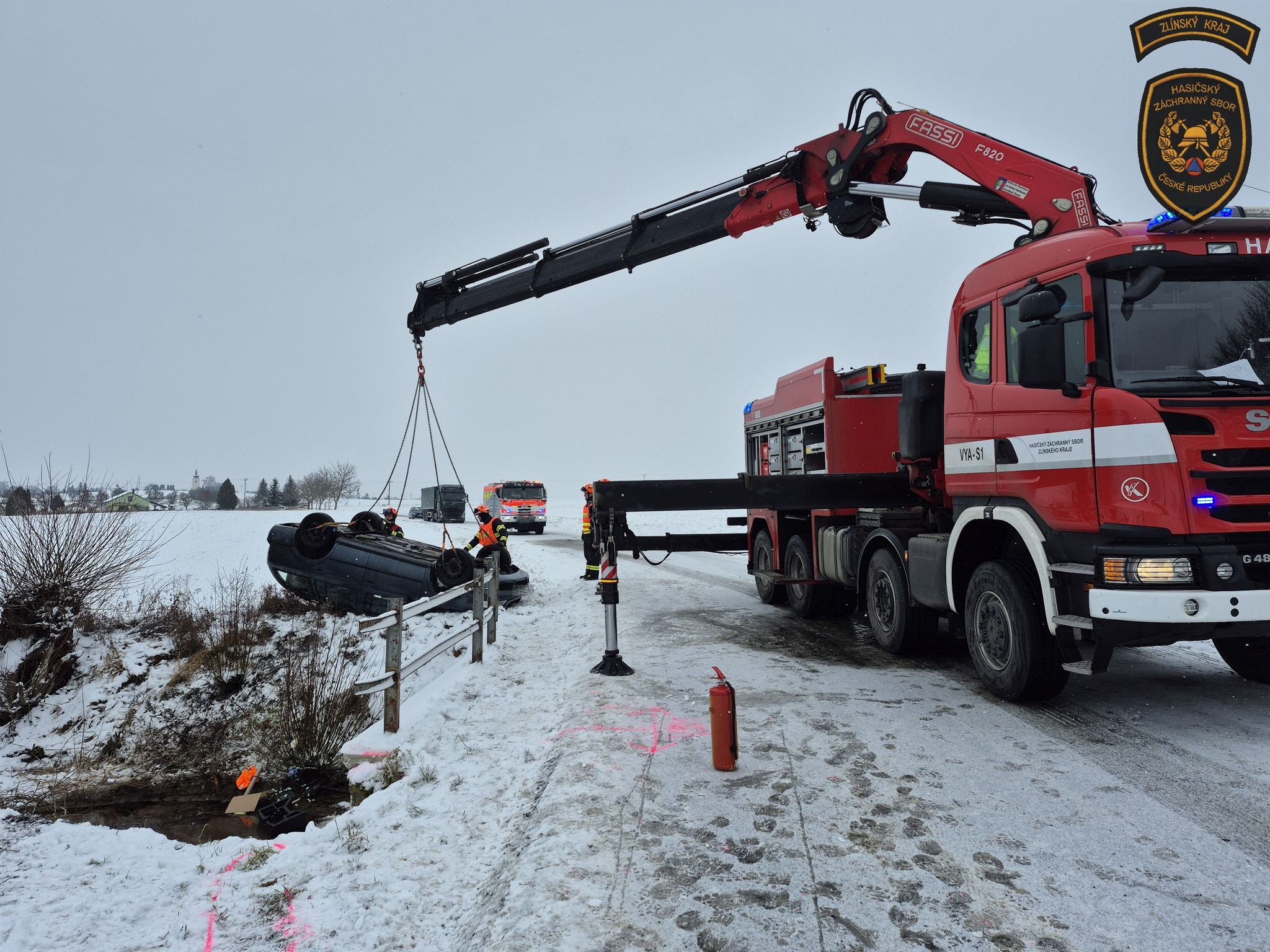 Vzhledem k poloze vozidla a náročnému terénu si velitel zásahu vyžádal na místo také vyprošťovací automobil ze stanice Zlín. Po zadokumentování nehody ze strany Policie ČR mohli hasiči přistoupit k samotnému vyproštění. Pomocí vyprošťovací techniky byl zdemolovaný vůz vytažen z koryta potoka a následně postaven na kola na volné ploše vedle komunikace tak, aby nebránil plynulosti silničního provozu a byl připraven k odtažení.