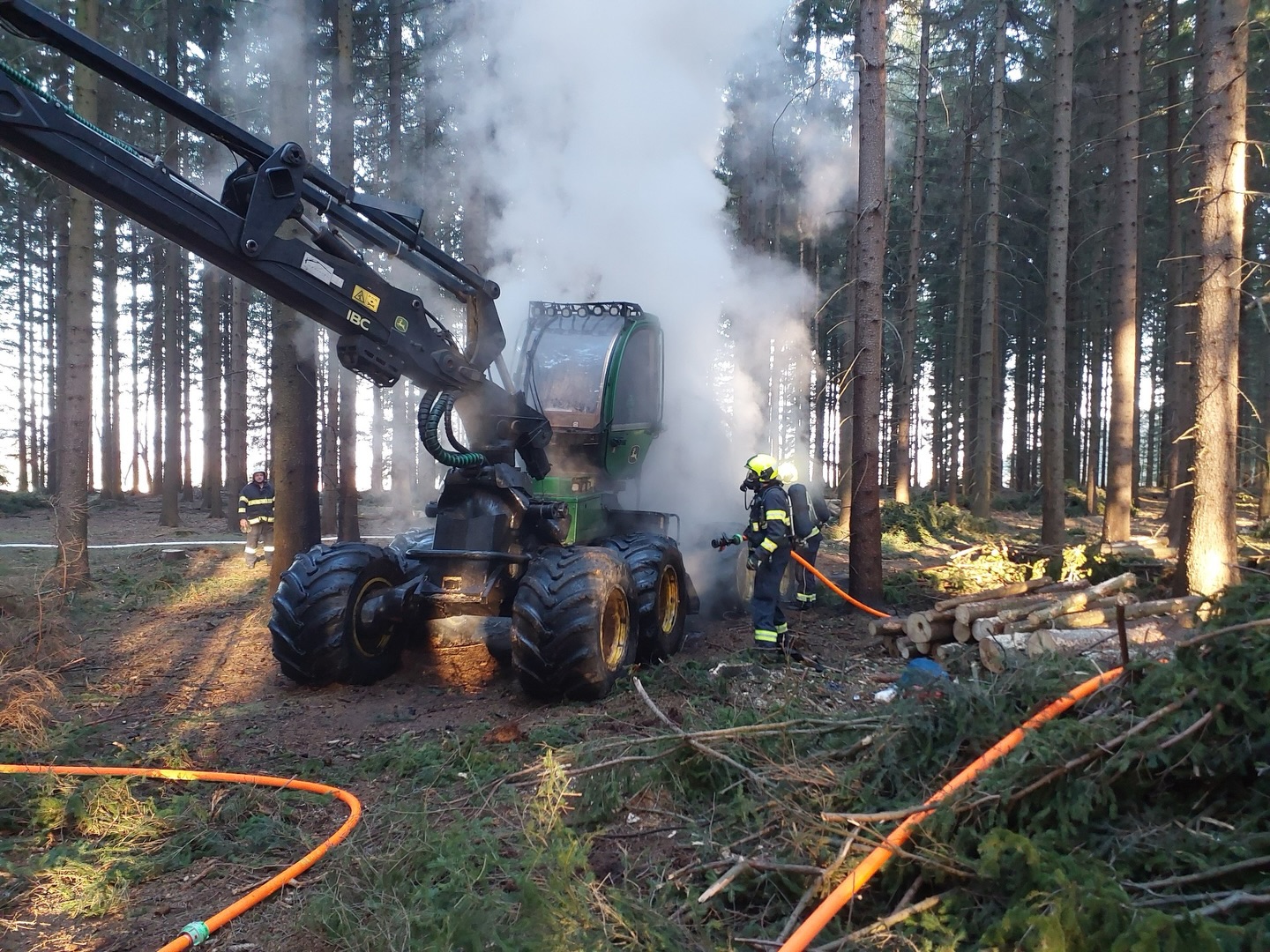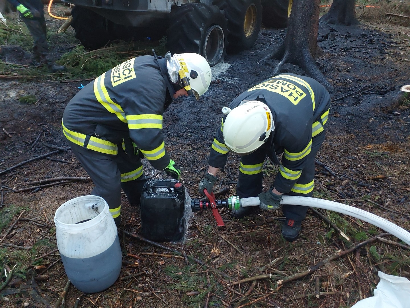 Zásah si vyžádal i technicky náročné práce – hasiči postupně rozebírali části harvestoru, aby se dostali k ovládacím prvkům stroje a mohli zastavit další únik kapalin. Práce probíhaly pod samotným strojem za použití speciálních ochranných obleků.