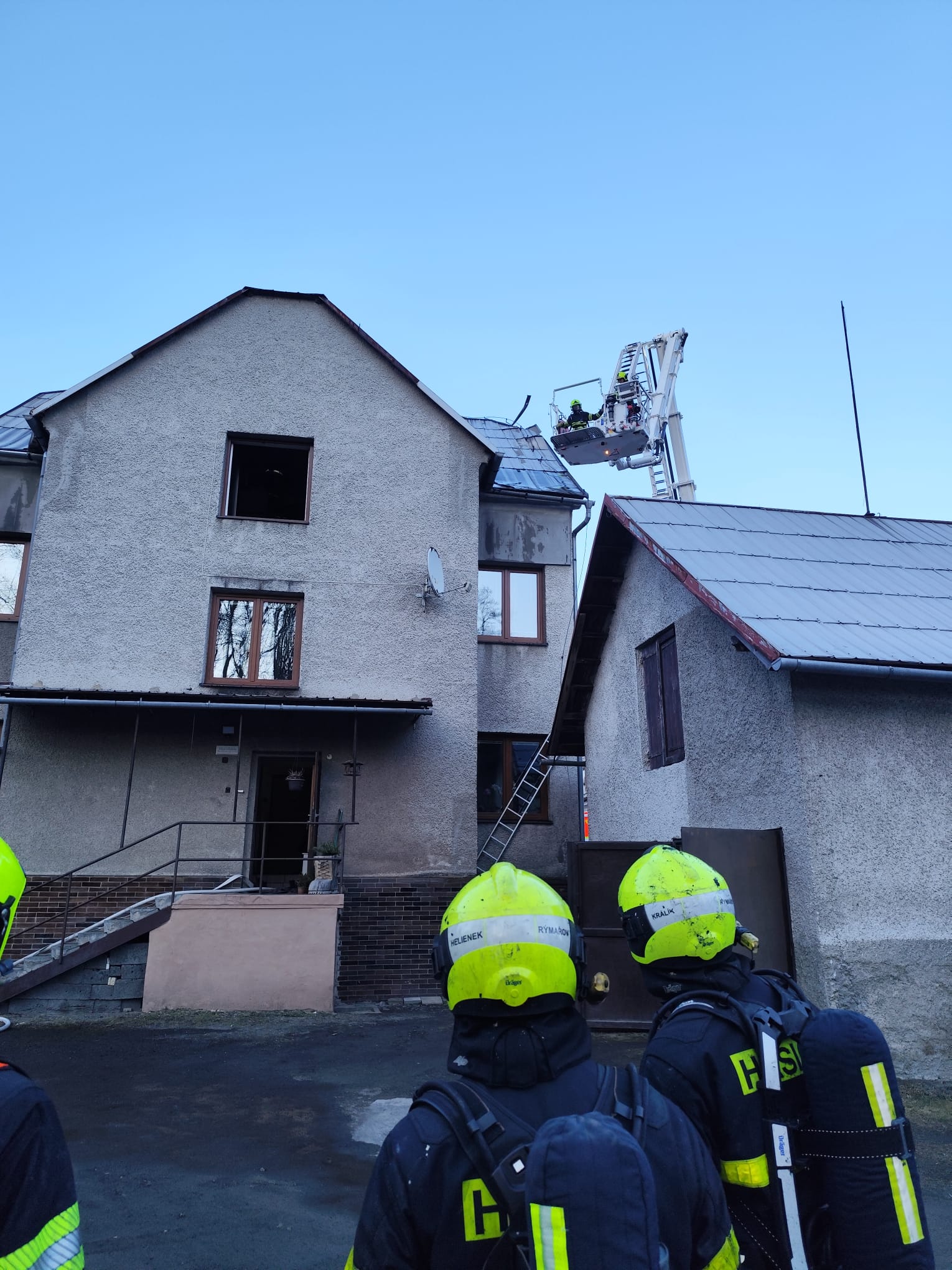 Po příjezdu hasiči zjistili, že požár zasáhl půdní prostory třípodlažního domu a přibližně polovinu střešní konstrukce. Jednotky okamžitě zahájily hasební práce a požár se podařilo dostat pod kontrolu přibližně za hodinu a půl od jeho nahlášení. Kvůli skrytým ohniskům museli hasiči rozebrat část plechové střešní krytiny.