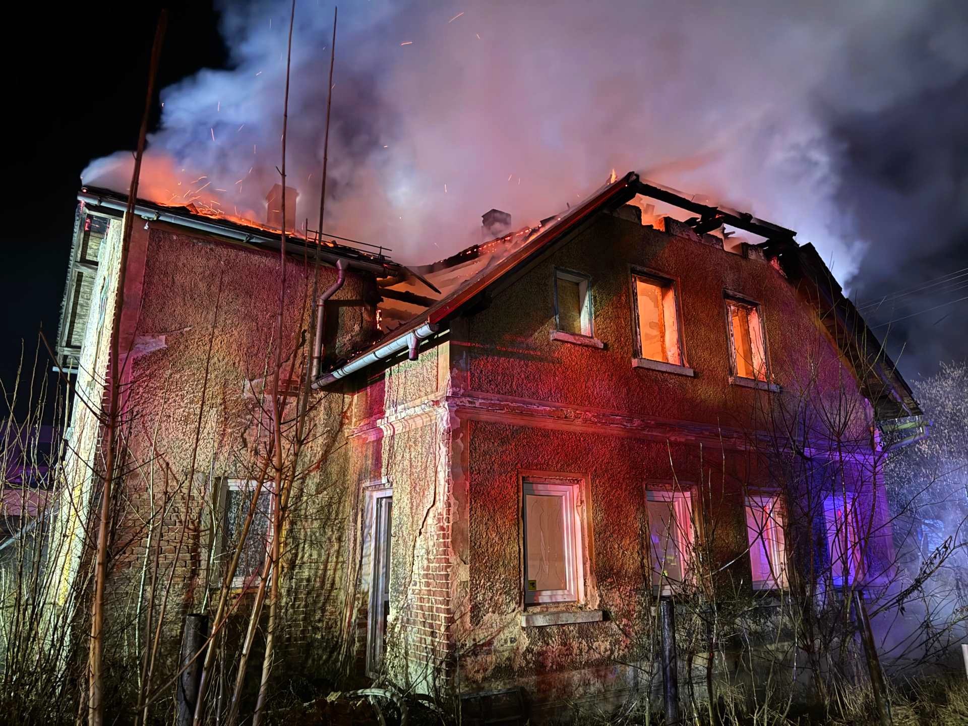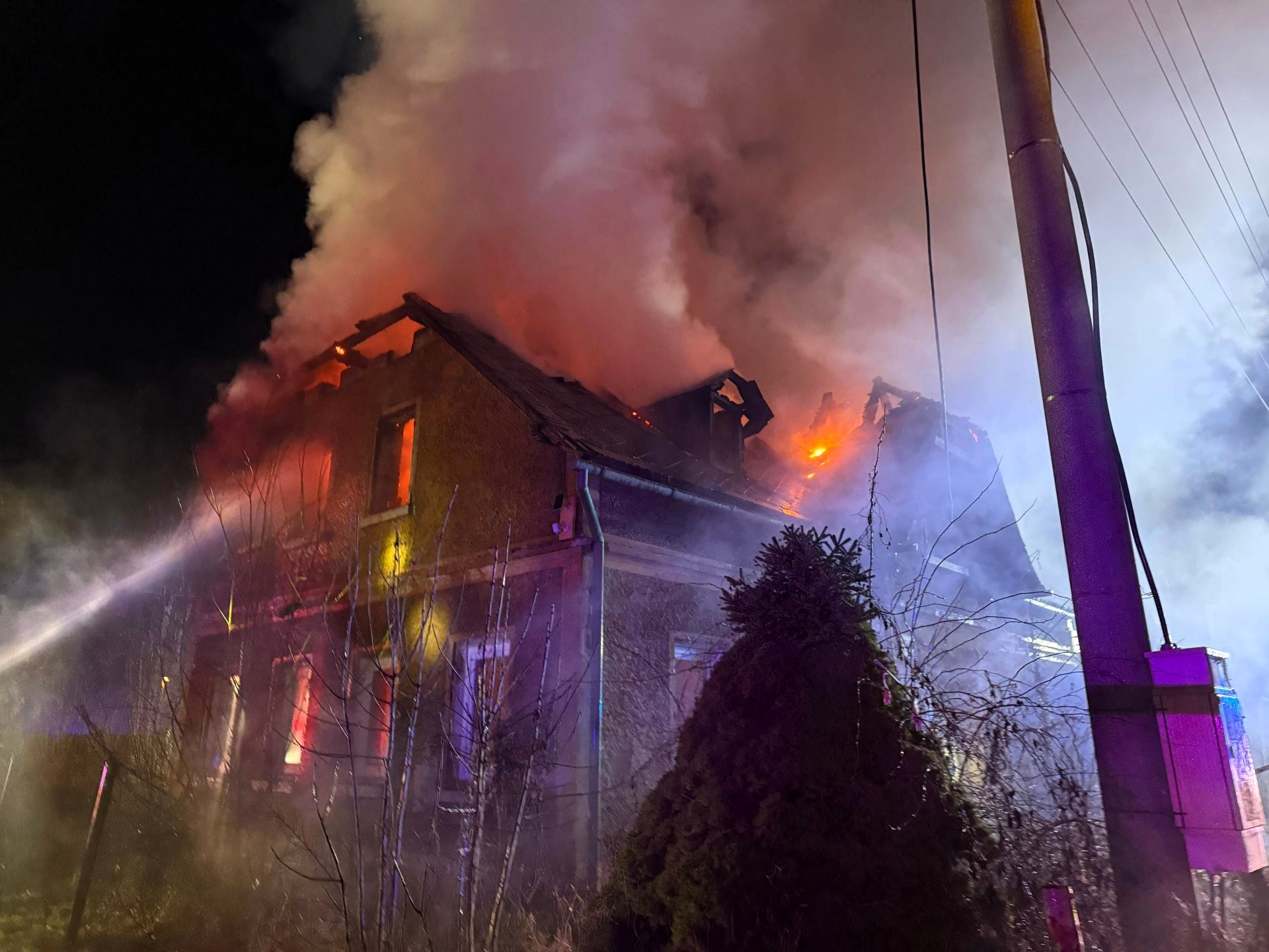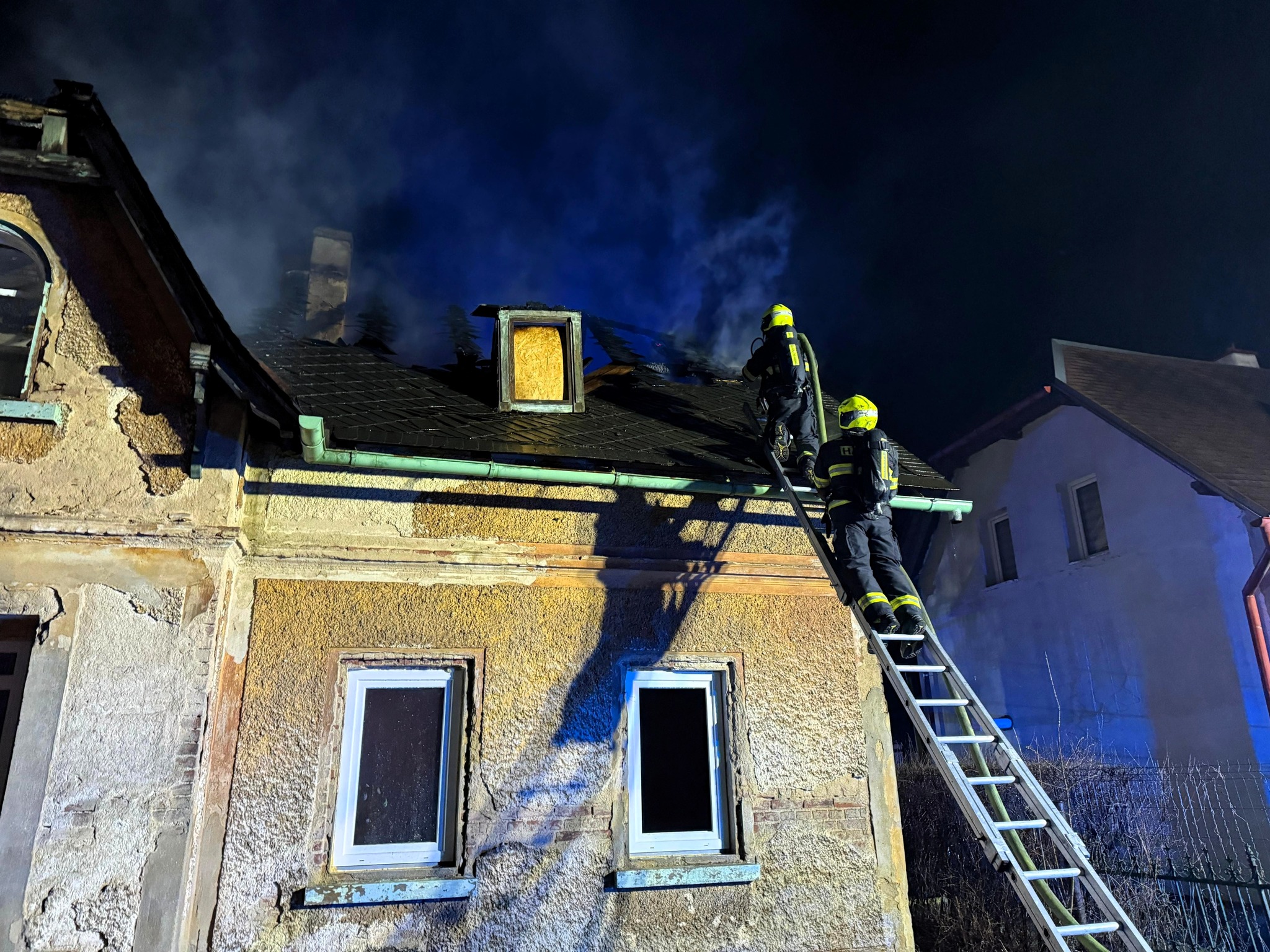 Při příjezdu jednotek požární ochrany byla v plamenech celá střecha domu i přízemí. Hasiči likvidovali požár třemi vodními proudy z venku a jedním uvnitř. Průzkumná skupina z HS Šluknov prováděla vyhledávání osob, nikdo další už se v domě nenacházel. Požár lokalizovali ve 3:28 hodin. Následně ustavili výškovou techniku, začali rozebírat konstrukce domu a hasili skrytá ohniska, která vyhledával také dron s termokamerou.