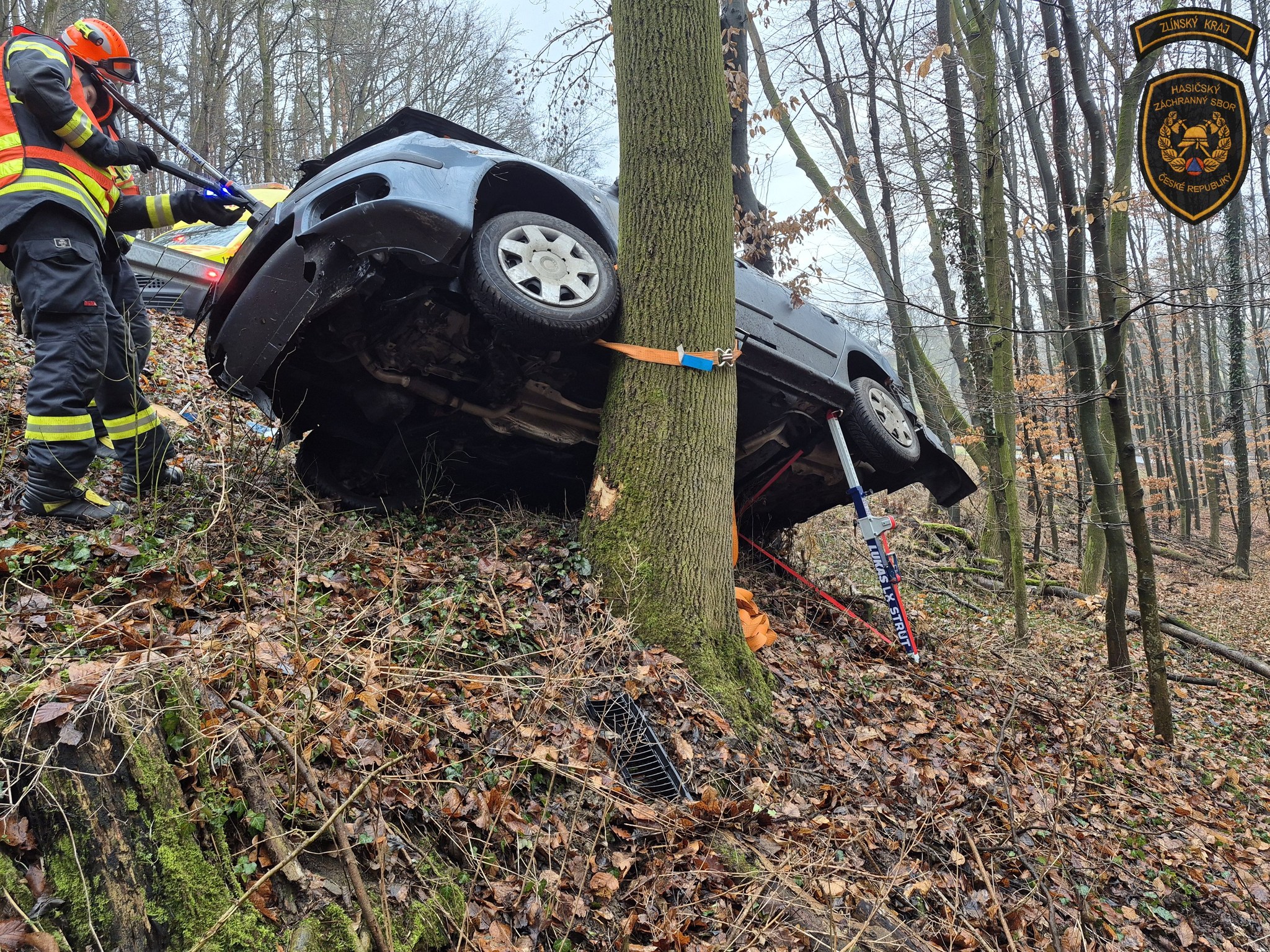 Na místo události byli okamžitě vysláni profesionální hasiči ze stanice Zlín. Ti po příjezdu zajistili havarovaný vůz proti nežádoucímu pohybu, aby zabránili jeho dalšímu pádu. Následně odpojili akumulátor a provedli další nezbytná protipožární opatření.