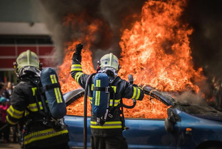 Hasiči předvedli i likvidaci požáru automobilu pomocí vysokotlakého proudu vody, kdy je voda rozprašována pod vysokým tlakem. Vytvoří se vodní mlha, která nedovolí přístupu vzduchu a dochází tak k uhašení požáru.