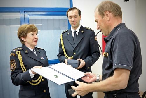 Do rukou mjr. Tinky cenu v Brně předala ředitelka odboru prevence Generálního ředitelství HZS ČR Květoslava Skalská a vedoucí oddělení zjišťování příčin vzniku požárů Generálního ředitelství HZS ČR Radek Kislinger.