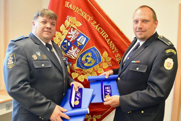Ředitel HZS Karlovarského kraje Václav Klemák ocenil pamětní medailí velitele jednotky dobrovolných hasičů z Teplé Karla Kyllera a velitele jednotky dobrovolných hasičů ze Skalné Romana Melničuka.