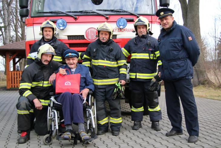 Nakonec z rukou velitele stanice Josefa Hanzla dostal senior drobné dárky a celá jednotka se s ním na závěr také památečně vyfotila.