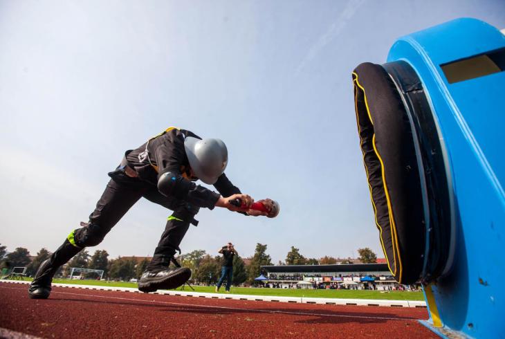Druhou disciplínou je štafeta s překážkami, kdy osm členů družstva formou štafetového běhu s proudnicí obíhá atletický ovál a závodníci přitom překonávají kladinu, bariéru (pouze muži) a také šestimetrovou rouru, kterou se musí obratně proplazit.