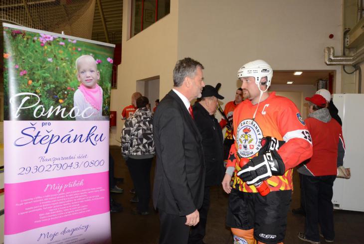 Ten také předával mamince Štěpánky na konci utkání nádherných 15 203 Kč. Dobrovolné vstupné bude určeno na rehabilitaci, která Štěpánce velmi pomáhá.