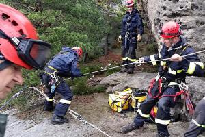 Liberečtí hasiči nacvičovali záchranu osob ze skalního masivu na Vlhošti