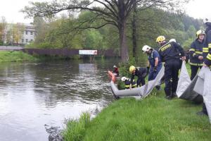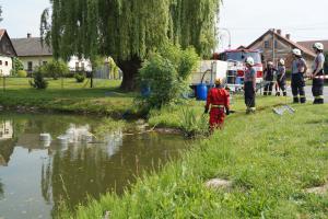 Hasiči cvičně likvidovali v Mžanech únik ropné látky do vody