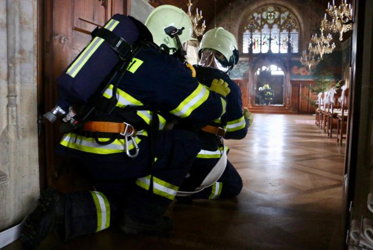 Po příjezdu jednotek hasičů na místo události obdržel velitel zásahu informace o situaci a probíhající evakuaci návštěvníků. Hasiči průzkumem zjistili, že uvrnitř sálu už nikdo není a nadále pokračuje evakuace osob z celého hradu.