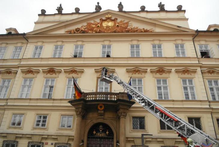 Před budovou a následně v budově proběhla součinnostní akce hradních hasičů a zaměstnanců velvyslanectví, zaměřená na požární bezpečnost a evakuaci.
