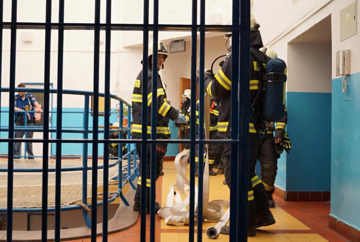 Cvičení zásahu u požáru ve vazební věznici proběhlo v prověřovacím režimu. Znamená to, že hasiči předem nevěděli, že se jedná o cvičení a na místo vyjeli jako k reálné události.