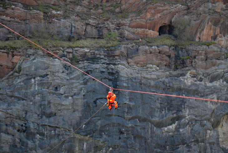 Pomocí dvojité kladky následně nacvičovali pohyb po šikmém traverzu. Členové lezeckého družstva si tak mohli vyzkoušet vzájemnou spolupráci při tvoření tohoto poměrně náročného lanového traverzu ve složitém terénu, včetně radiové komunikace.