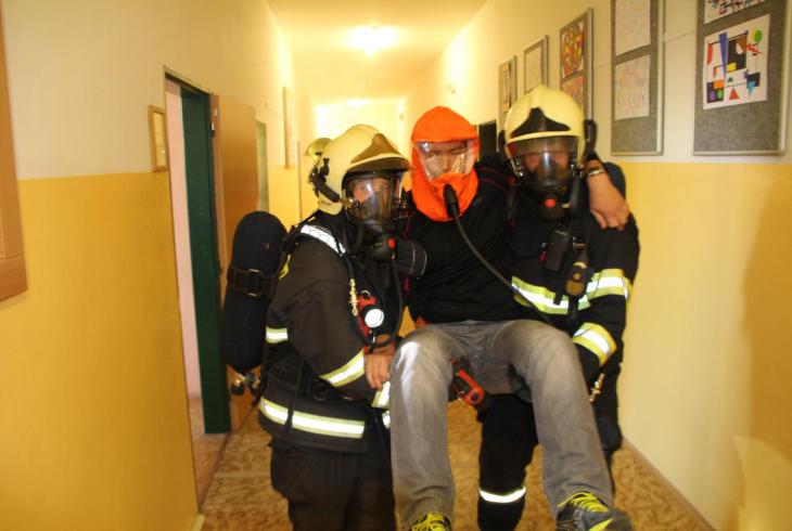 Druhá skupina hasičů mezitím natáhla dopravní a útočné vedení do zasažených prostorů školy, kde následně fiktivně zlikvidovala simulovaný požár kabinetu. Současně s tím byl proveden průzkum celého objektu, aby se vyloučila možnost dalších osob v budově.