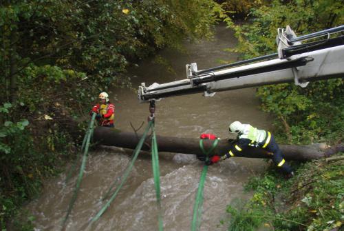 Do koryta potoka potom vstoupili dva profesionální hasiči ze Slezské Ostravy v nepromokavých kombinézách (voda jim sahala hodně nad kolena), kteří ve spolupráci s vazačem z Ostravy-Zábřehu uvázali silný kmen na obou koncích pomocí dlouhých popruhů.