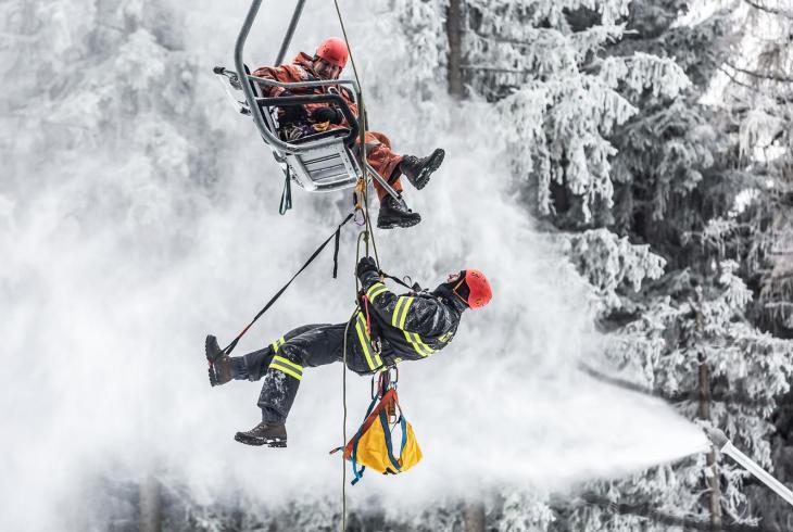 Lezci speciálně proškoleni na záchranu osob ve výškách a nad volnou hloubkou obsadili většinu sloupů po celé délce lanovky. Na ní nacvičovali, jak se dostat k osobám uvízlým na sedačce v několikametrové výšce.
