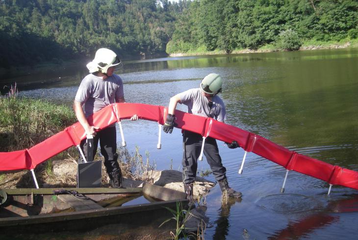 Průzkum na místě ukázal, že olejová skvrna se shlukuje při pravé straně řeky a "couvá" proti směru toku...Takový byl námět prověřovacího cvičení jihočeských profesionálních hasičů a hasičů elektrárny Temelín.